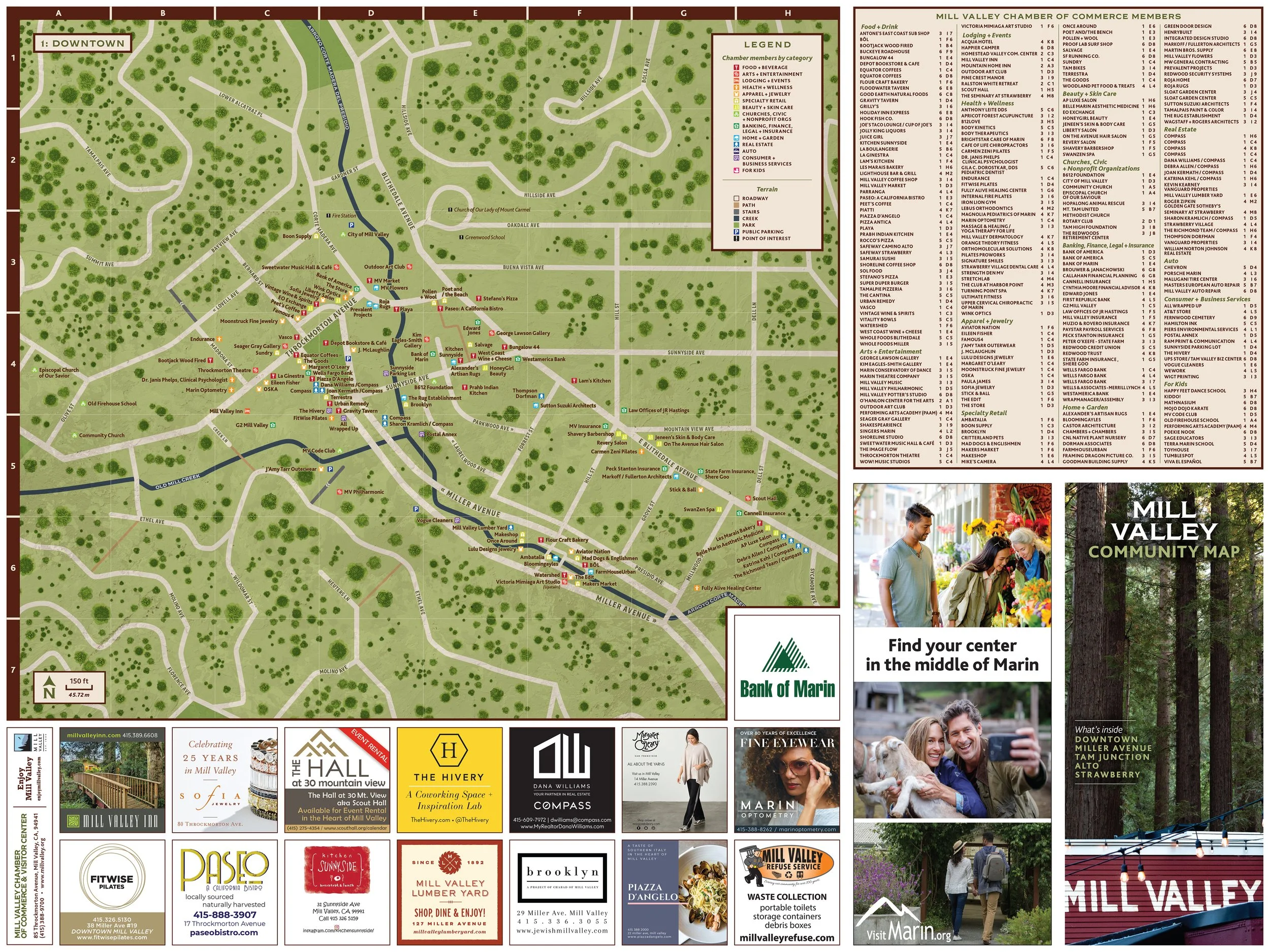 Mill Valley Chamber needed to provide area visitors a reference map for local shops, restaurants, and services—additionally, serving as an introduction to Mill Valley.